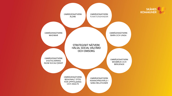 Under maj och juni startar Skånes Kommuner upp de åtta regionala områdesnätverk med representanter från de skånska kommunerna. Det strategiska nätverket för hälsa, social välfärd och omsorg har utsett representanterna i de åtta nätverken. Områdesnätverken arbetar på uppdrag av det strategiska nätverket och rapporterar även till det. Områdesnätverken hålls samman av strateger från Skånes Kommuner utifrån rollen som RSS – Regional Samverkansstruktur.
