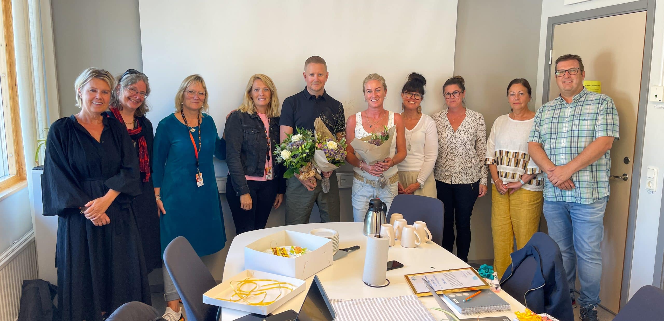 Emma och Calle trodde att de var på ett vanligt möte så förvåningen syntes i deras ansikten när delegationen bestående av ordförande från omsorgsnämnden, deras chefer och representanter från Skånes Kommuner och Region Skåne kom in i rummet med blommor och tårta för att gratulera dem.